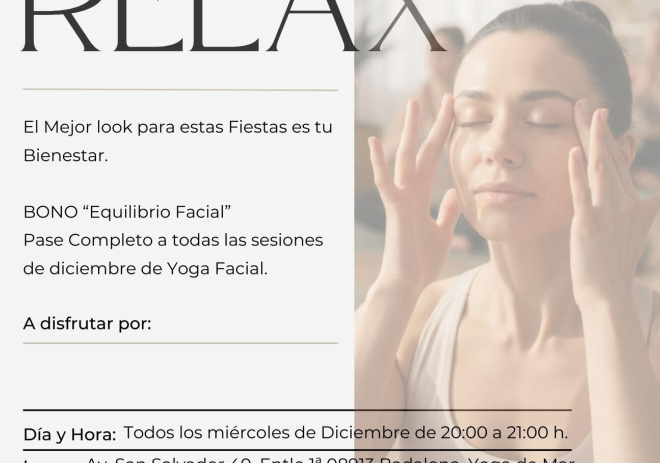 Reduce el estrés y las arrugas, mejora la firmeza y la expresión, reduce la papada y define el óvalo facial, mejora la postura, la confianza y seguridad personal. Una práctica Integral para tu Bienestar y Belleza.¡Este Diciembre Ponte guapa por dentro y por fuera!Hemos preparado el Bono "Equilibrio Facial"-Pase completo a todas las sesiones de diciembre que se realizarán los miércoles de 20:00 a 21:00 h en Badalona, para que tú o esa persona especial disfrute de un diciembre de Bienestar, Belleza y Relajación.Haz clic en el enlace para conocer más detalles y adquirir tu bono .